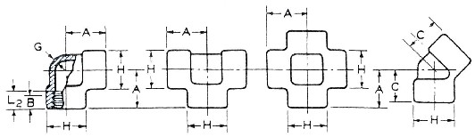 | DN | Nom. Pipe Size | Center to end Elbows, Tees, Crosses A | Center to end 45° Elbows C | Outside Diameter of band H | Minimum Wall Thickness G | Length of Thread Min.(1) | |||||||||